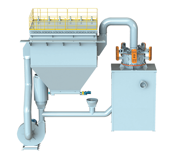 闭路系统:物料通过给料机定量进入进料管道,与系统进风混合均匀后,由下端入料口进入分级机,符合粒径要求的细颗粒随气流进入旋风收集器,经收集细粉后的气流再次回到分级机,形成闭路,循环的气流一部分进入余风脉冲,经除尘后排出,粗颗粒夹带部分细颗粒沿筒壁下降至二次风处,经二次风的淘洗作用,使粗细颗粒分离,细颗粒上升至分级区进行二次分级,粗颗粒下降至下料口排出。